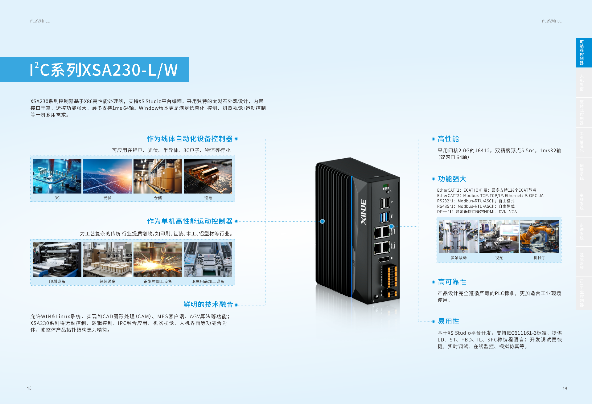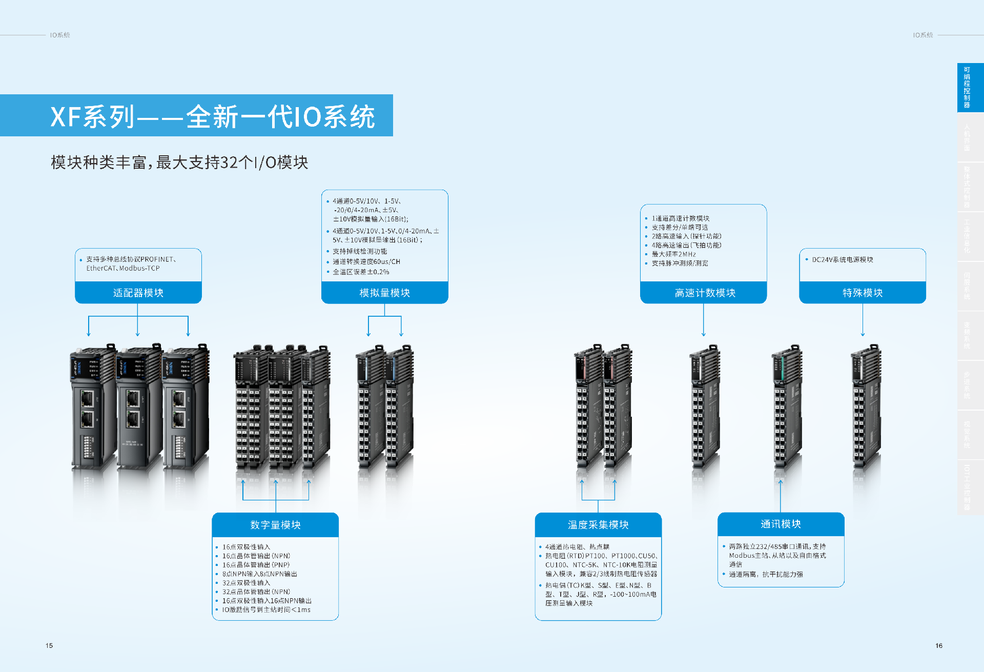 XSF5系列及IO模块为⼑⽚式设计,具有超薄机⾝,最⼤⽀持32个扩展模块;XSA系列⼯业智能控制器基于X86处理器,性能更卓