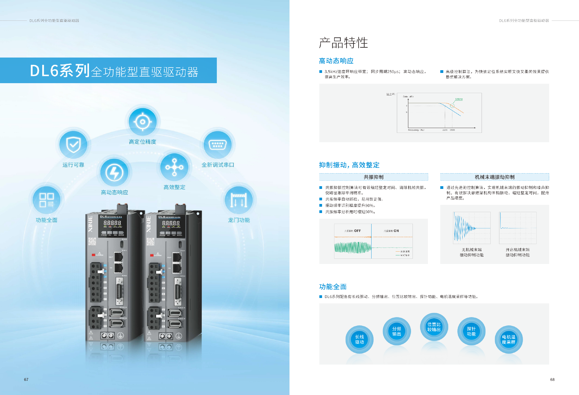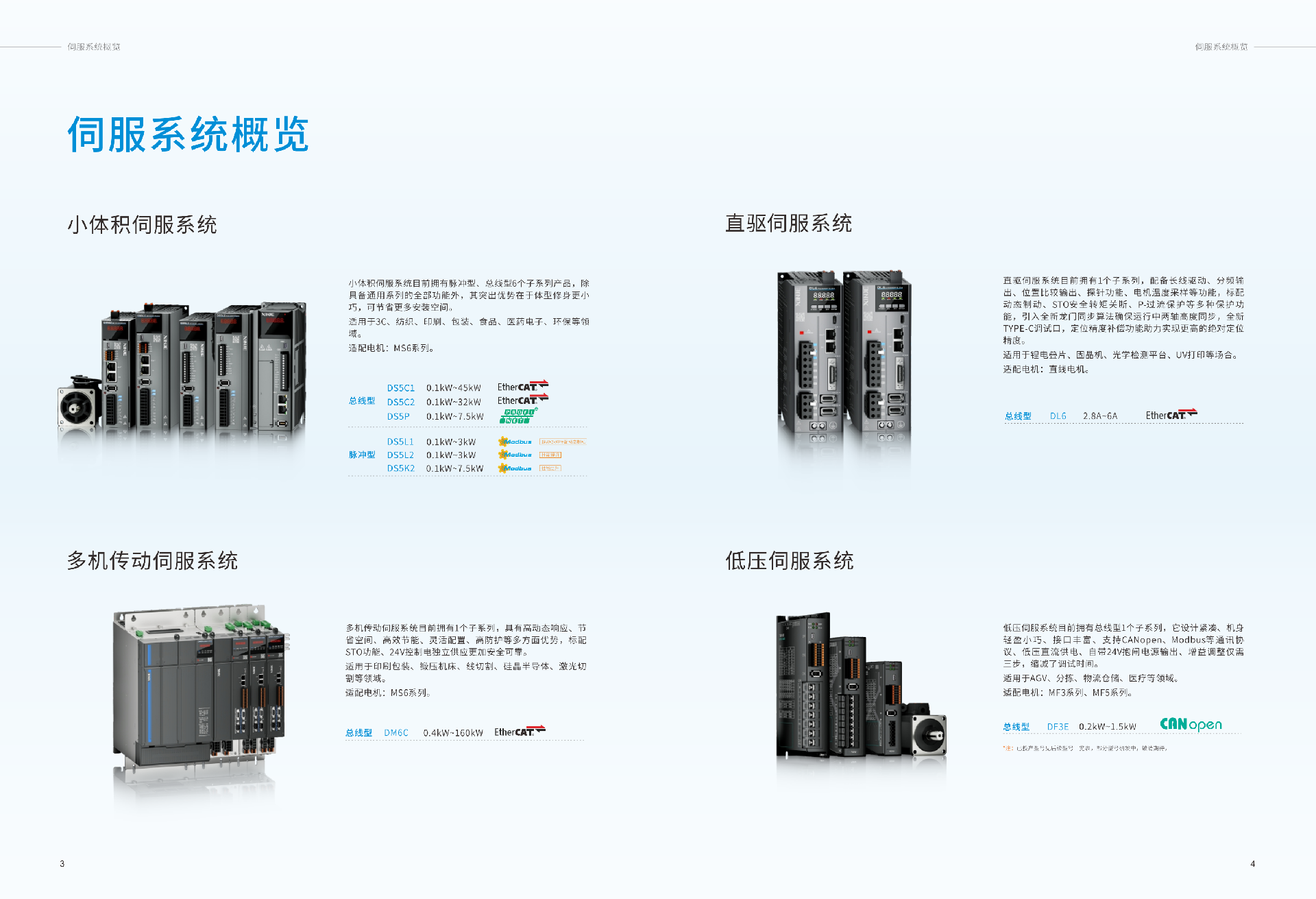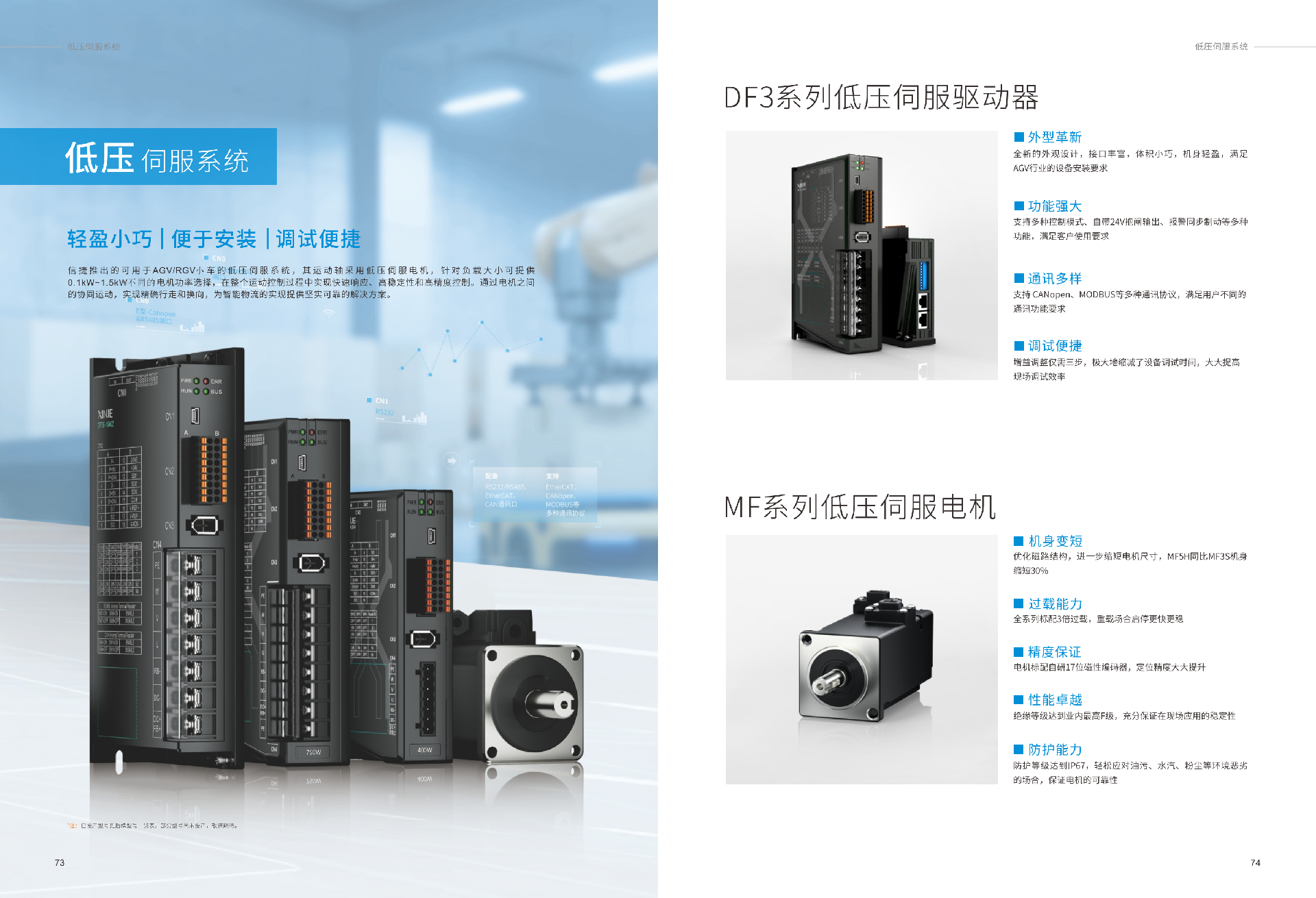 低压伺服系统目前拥有总线型1个子系列,它设计紧凑、机身轻盈小巧、接口丰富、支持CANopen、Modbus等通讯协议、低压直流供电、自带24V抱闸电源输出、增益调整仅需三步,缩减了调试时间。